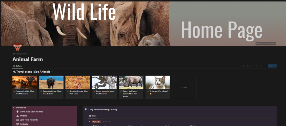 This Template demonstrates a Wildlife Notion Template for animal lovers, animal socialists, Aspiring Zoologists and more. The Wildlife Notion Template is a comprehensive and customizable digital workspace designed to assist individuals in pursuing their dreams, hobbies or careers in animals, and zoology. This template provides a structured framework for organizing research, documenting findings, and streamlining the study process. It caters specifically to those interested in wildlife and aims to enhance their knowledge and preparation for working with diverse animal species.